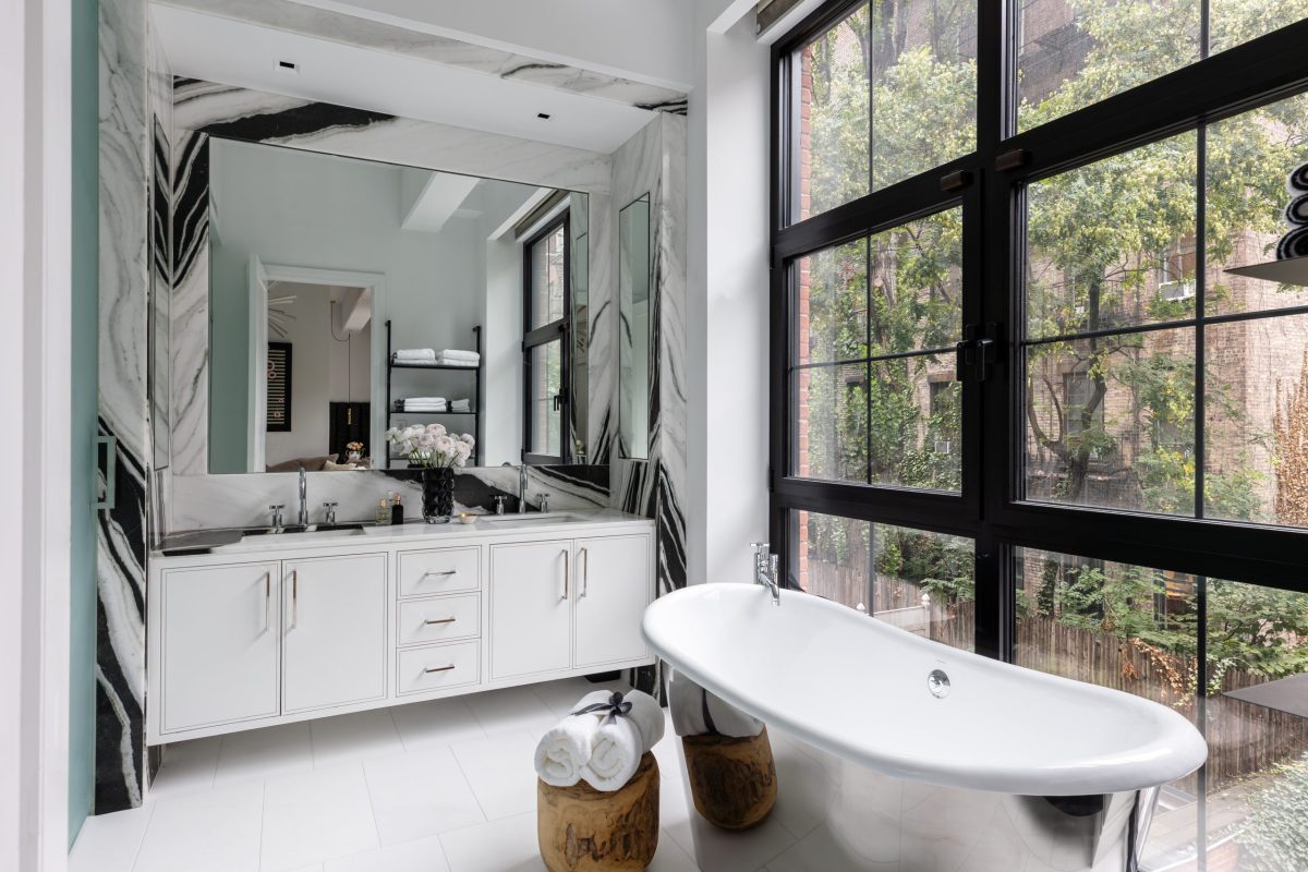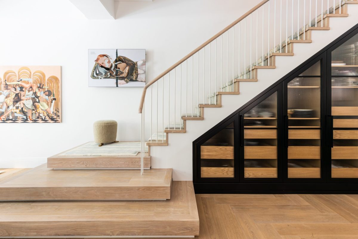 One of our most recent projects is a stunning two-story townhouse on Manhattan’s Upper East Side, designed to balance modern luxury with thoughtful functionality. From the moment you enter, the grand foyer stair — illuminated with subtle LED side lighting and dressed in a custom wool runner — sets the tone for the home’s refined style. Beneath the stair, built-in storage is seamlessly integrated, while black-framed ribbed glass doors conceal additional rollout storage, offering both beauty and practicality.