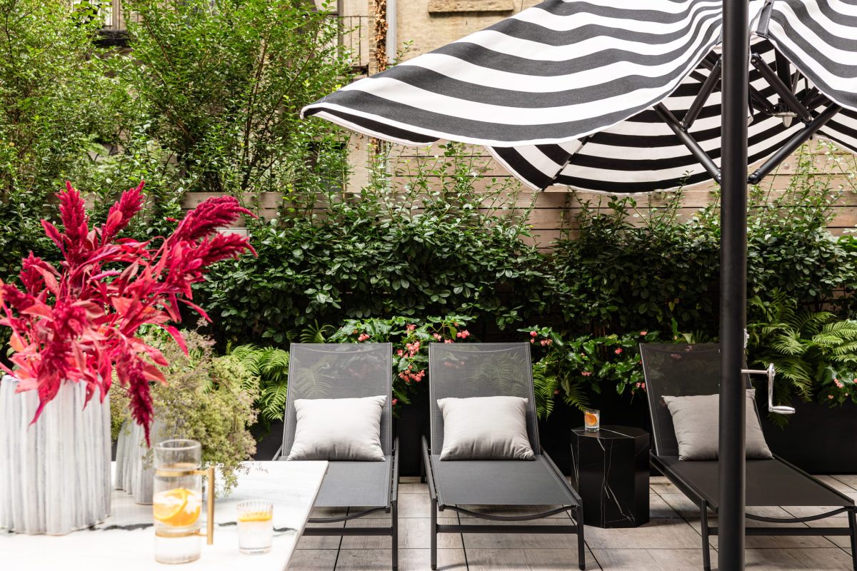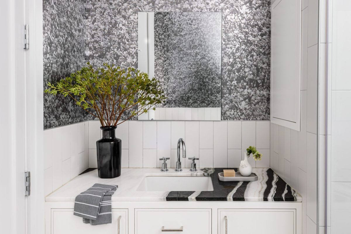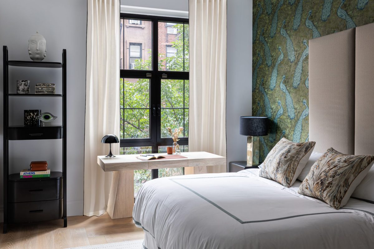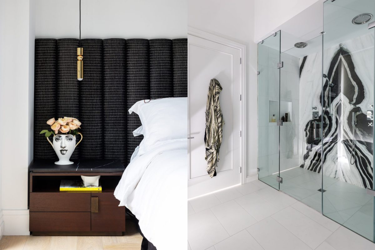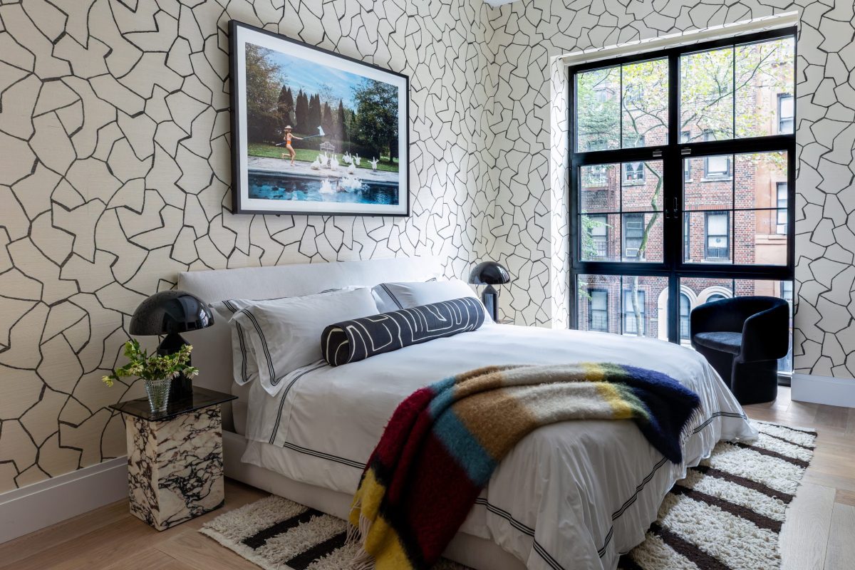 All bedrooms are located on the second floor, including three guest suites with en suite baths and a luxurious primary suite with a private sitting area. The primary bedroom’s custom upholstered headboard is framed by Tom Dixon brass pendants and complemented by Holly Hunt marble top nightstands. A B&B Italia sofa in the sitting area offers the perfect place to relax and unwind at the end of the day. In the primary bathroom, striking Panda marble is used throughout, with book-matched slabs in the shower creating a dramatic feature wall. Each guest bedroom is designed with its own distinct personality, featuring unique wallpapers that ensure every visit is memorable and thoughtfully considered.