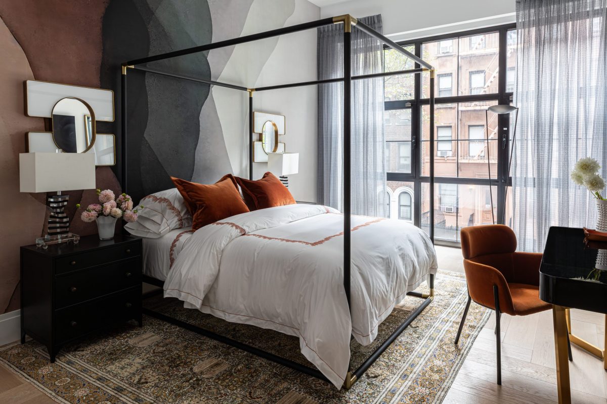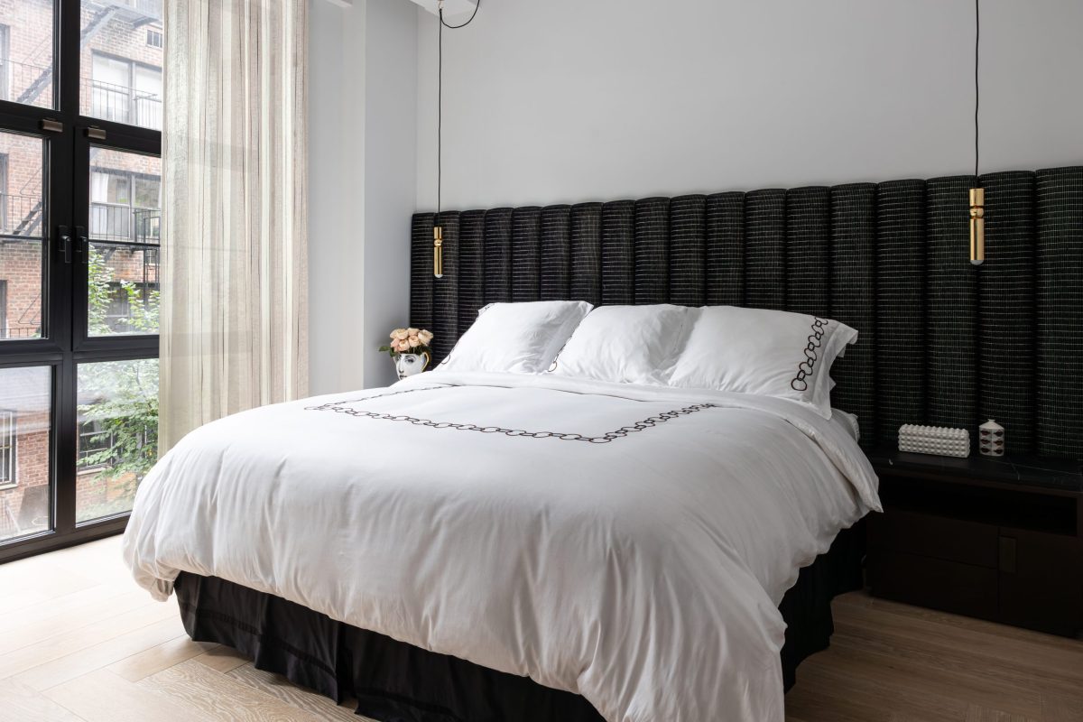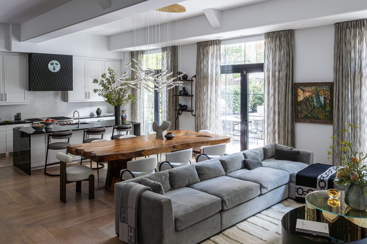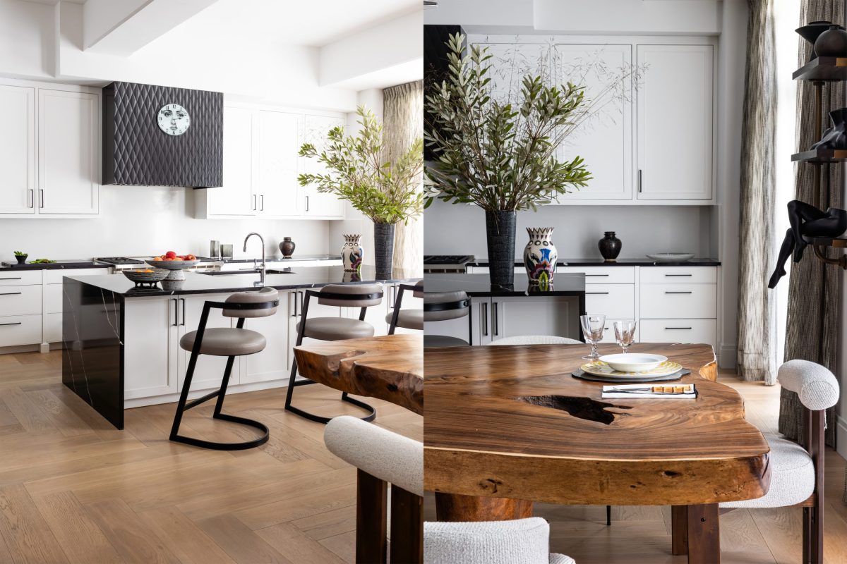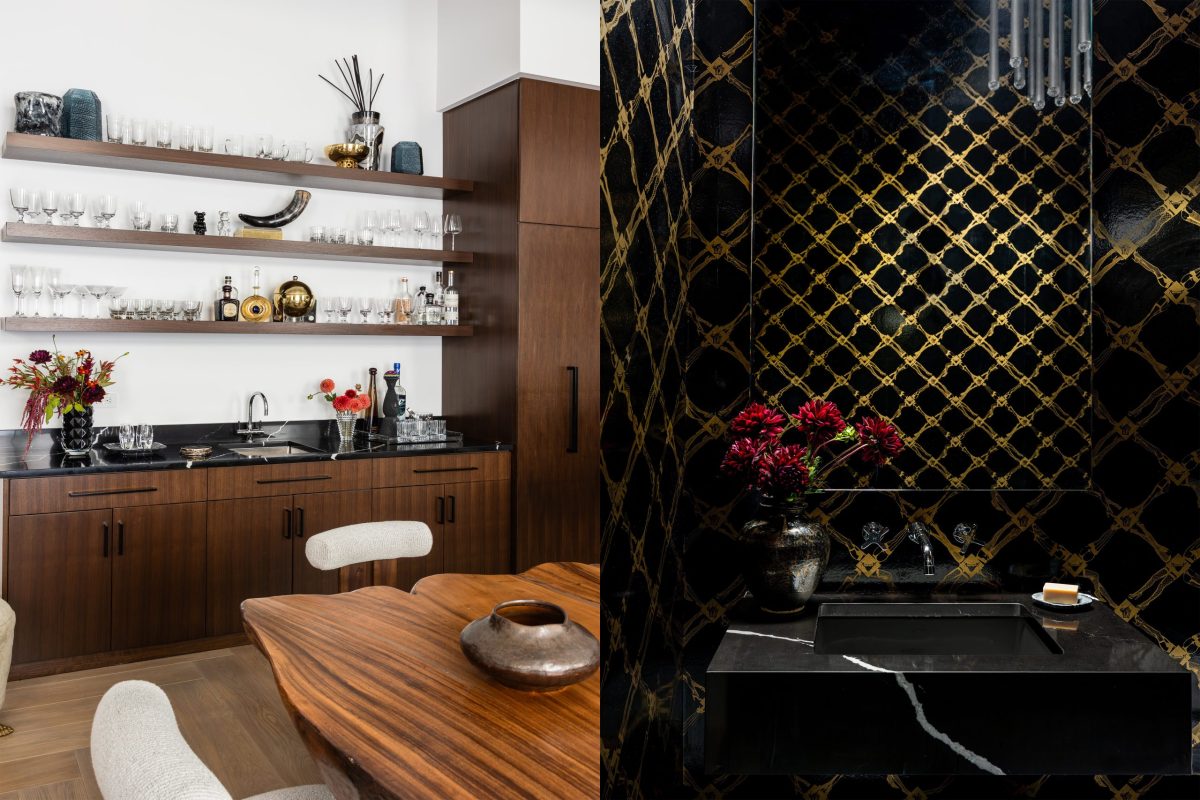 The dining area features a hand-selected wood slab table imported from Bali, paired with stunning upholstered chairs with hammered metal legs. Above, a dramatic installation of sixty glass orbs suspended from a brass base creates a stunning focal point. In the kitchen, floor-to-ceiling millwork conceals all appliances to achieve a clean, dramatic aesthetic, while custom bar shelving artfully displays the family’s glassware and curated sculptures.