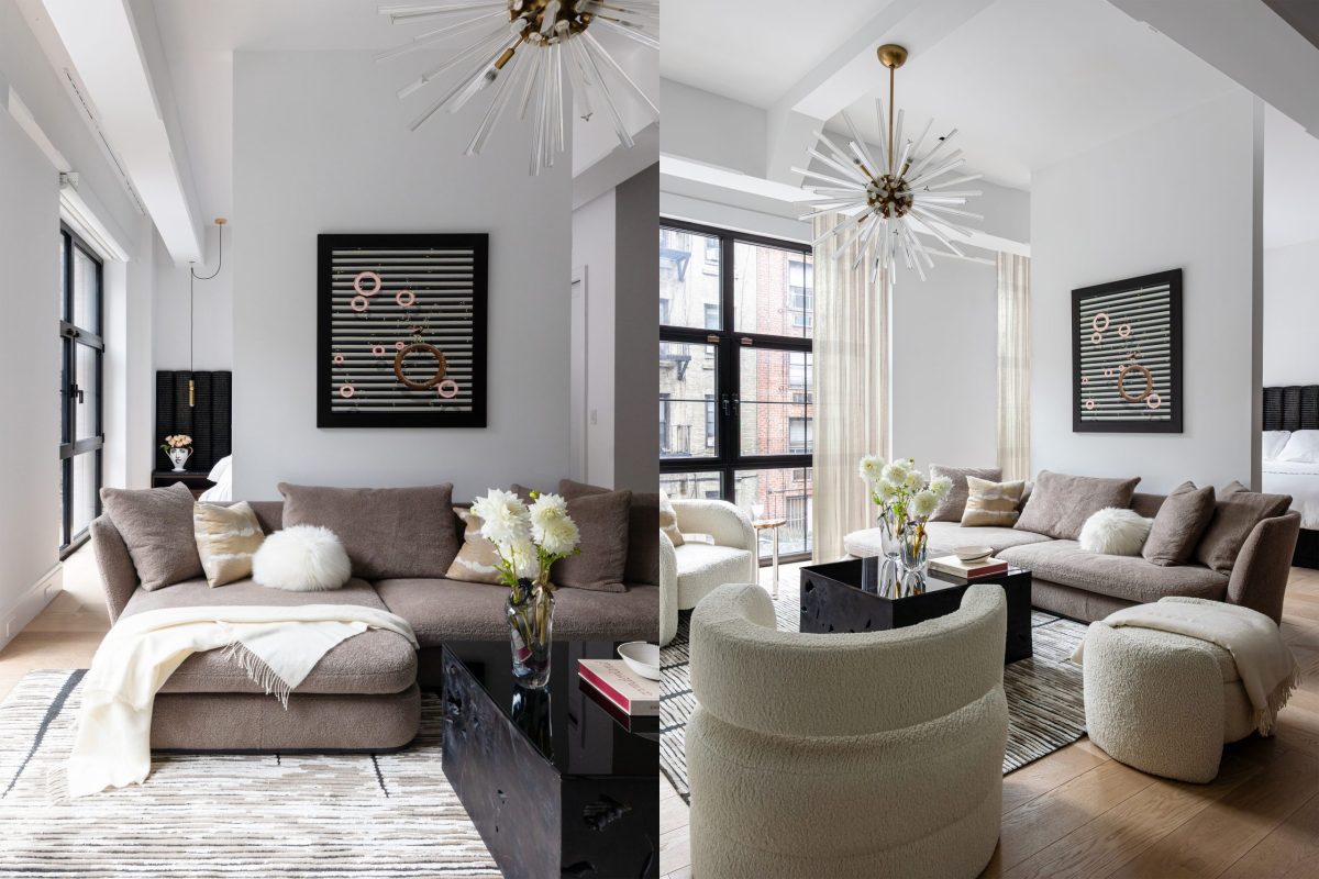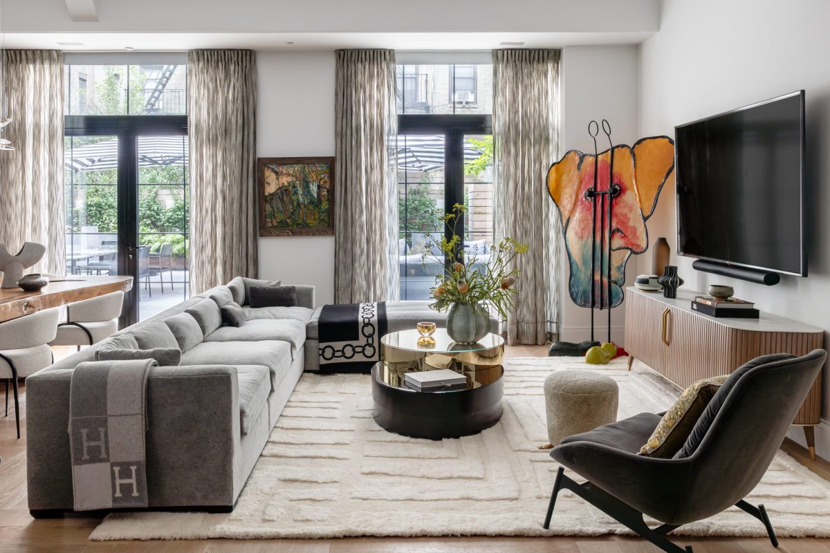 With soaring sixteen-foot ceilings and expansive architectural volumes, lighting and storage were central to the design vision. Custom floor-to-ceiling storage solutions and sculptural chandeliers were thoughtfully installed throughout the home, creating layers of light and maximizing functionality. Expansive windows and doors leading to a private patio flood the open-plan living room, dining room, and kitchen with natural light, enhancing the airy, welcoming atmosphere. A luxurious mohair sectional and custom black and brass metal coffee table anchors the living space atop a plush wool rug, offering a comfortable yet elevated gathering spot for the family.